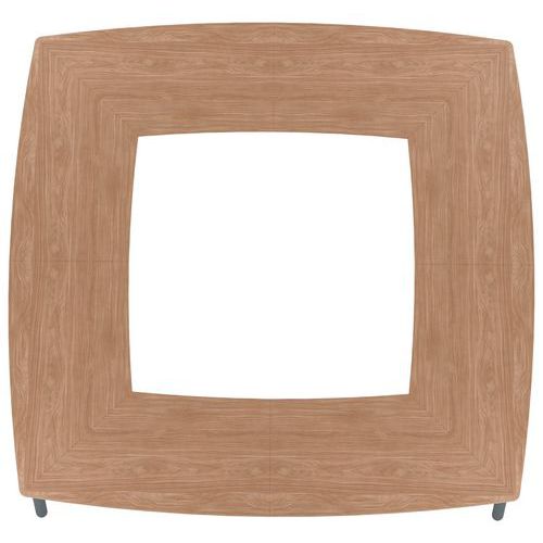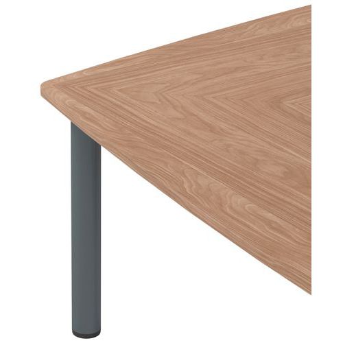 Table réunion Atem 16 personnes pieds ronds. Plateau en panneau de particules agglomérées haute densité (680 kg/m3) et classé non feu catégorie M3 revêtu de mélaminé ép 25mm. Chant épaisseur 2 mm plaqué sur la périphérie du panneau. Inserts métalliques intégrés sous le plateau pour faciliter le montage et remontage des pieds et platine de liaison pour assemblage des plateaux entre eux. Pieds tubes rond en acier finition époxy. Vérins de réglage course de 15 mm.