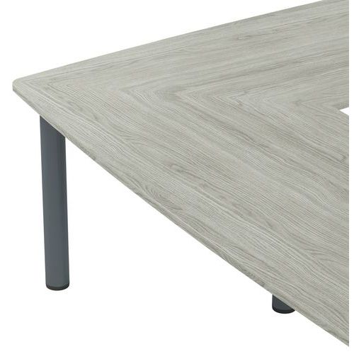 Table réunion Atem 20 personnes pieds ronds. Plateau en panneau de particules agglomérées haute densité (680 kg/m3) et classé non feu catégorie M3 revêtu de mélaminé ép 25mm. Chant épaisseur 2 mm plaqué sur la périphérie du panneau. Inserts métalliques intégrés sous le plateau pour faciliter le montage et remontage des pieds et platine de liaison pour assemblage des plateaux entre eux. Pieds tubes rond en acier finition époxy. Vérins de réglage course de 15 mm.
