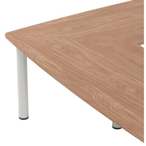 Table réunion Atem 20 personnes pieds ronds. Plateau en panneau de particules agglomérées haute densité (680 kg/m3) et classé non feu catégorie M3 revêtu de mélaminé ép 25mm. Chant épaisseur 2 mm plaqué sur la périphérie du panneau. Inserts métalliques intégrés sous le plateau pour faciliter le montage et remontage des pieds et platine de liaison pour assemblage des plateaux entre eux. Pieds tubes rond en acier finition époxy. Vérins de réglage course de 15 mm.