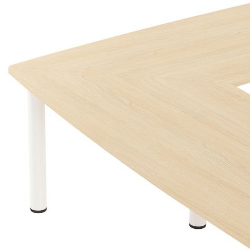 Table réunion Atem 22 personnes pieds ronds. Plateau en panneau de particules agglomérées haute densité (680 kg/m3) et classé non feu catégorie M3 revêtu de mélaminé ép 25mm. Chant épaisseur 2 mm plaqué sur la périphérie du panneau. Inserts métalliques intégrés sous le plateau pour faciliter le montage et remontage des pieds et platine de liaison pour assemblage des plateaux entre eux. Pieds tubes rond en acier finition époxy. Vérins de réglage course de 15 mm.