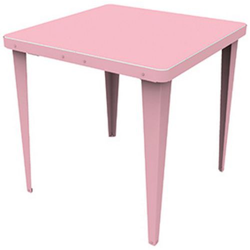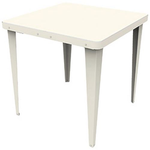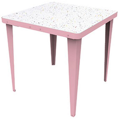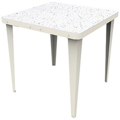 Mobilier éco-conçu, durable et réparable. En un tour de main, sans aucun outil, il est possible de retourner leur plateau et donc de changer complètement leur esthétique. Une face en acier coloris assortis au piètement et une face en PEHD ( polyéthylène haute densité)100% issu de l'économie circulaire soit blanc moucheté soit décor confettis de style terrazzo. Montage très rapide et livraison à plat pour des gains de volume de transport. Fabrication française. Le coloris confettis est obtenu en mélangeant des bouchons de bouteille qui sont broyés et du polyéthylène haute densité 100% recyclé blanc moucheté.