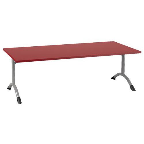 Table avec plateau stratifié, dessous contrebalancement, chant plaqué ABS contretypé. Piètement acier, soudé et composé de 2 fûts tube oblong, 2 embases cintrées en tube et 1 entretoise en tube. Contact au sol par 4 embouts en polyamide noir et 4 vérins de réglage en polyamide noir. Fixation du plateau par vis
