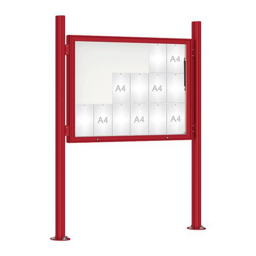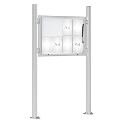 Vitrine 1000 simple face. Vitrage : Plexichocs. Finition intérieure : fond en tôle galvanisée laquée blanc, dos peint gris clair. Cadre : aluminium anodisé argent ou peint Fermeture : serrure de sécurité avec 2 clés. Joint élastomère d'étanchéité. Fixation sur 2 poteaux Quatro oblongs de section 80 x 125 mm, en aluminium, livrés avec bouchons en tôle d’acier noir vissés et 4 pièces de liaison pour une fixation rapide et sans perçage. Pose sur platines. Aimants offerts