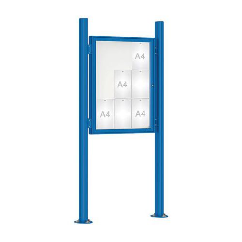 Vitrine 1000 simple face. Vitrage : Plexichocs. Finition intérieure : fond en tôle galvanisée laquée blanc, dos peint gris clair. Cadre : aluminium anodisé argent ou peint Fermeture : serrure de sécurité avec 2 clés. Joint élastomère d'étanchéité. Fixation sur 2 poteaux Quatro oblongs de section 80 x 125 mm, en aluminium, livrés avec bouchons en tôle d’acier noir vissés et 4 pièces de liaison pour une fixation rapide et sans perçage. Pose sur platines. Aimants offerts
