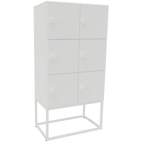 Casier de rangement Kim. Porte avec serrure à code et amortisseur de fermeture. Meuble monté sur socle métal blanc. Dimensions utiles d'1 case : P 42,5 x H 37 x L 37 cm. Pour les casiers avec le verouillage à code reconfigurable, la clé qui permet de réinitialiser le code n'est pas fournie.