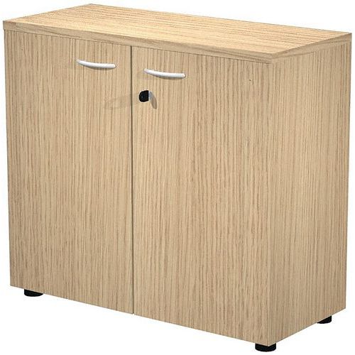 Meuble bas Fast à portes coulissantes. Etagère repositionnable en hauteur. Socle équipé de vérins de réglages. Jeu de portes battantes.