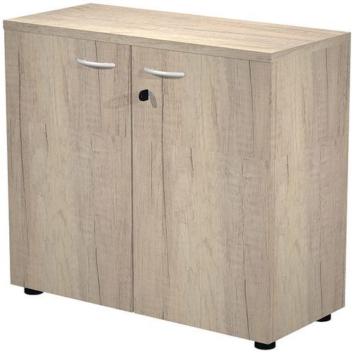 Meuble bas Fast à portes coulissantes. Etagère repositionnable en hauteur. Socle équipé de vérins de réglages. Jeu de portes battantes.