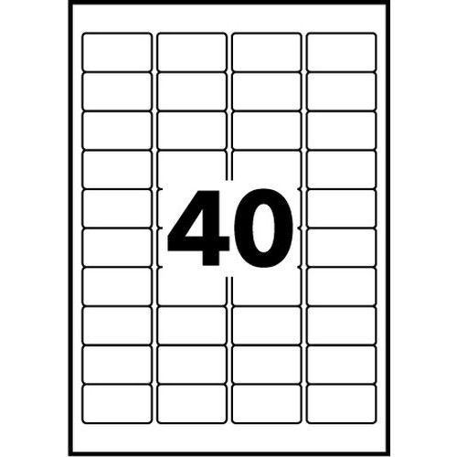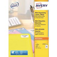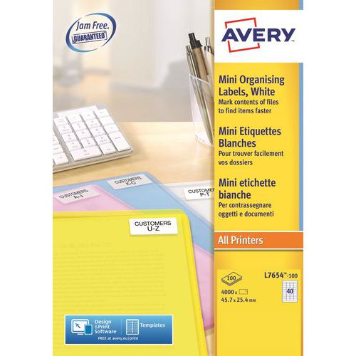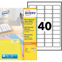 Mini-étiquette Avery, Nb d'étiquettes/planche: 40, Nb d'étiquettes: 4000, Étiquette longueur: 45.7 mm Mini-étiquette Avery, Nb d'étiquettes/planche: 40, Nb d'étiquettes: 4000, Étiquette longueur: 45.7 mm
