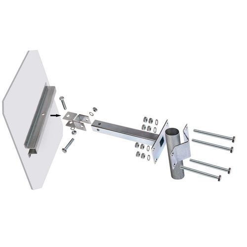 Livré avec bras de fixation + visserie pour fixation murale ou sur poteau Ø 60 à 90 mm.