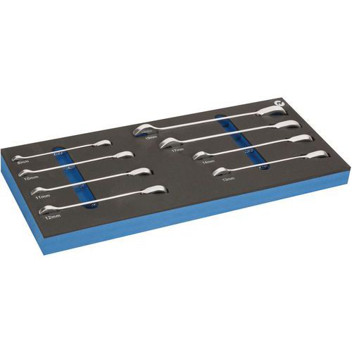 | Intitulé du produit | Mousse 1/3 Clés mixtes à cliquet 8 pièces, Nb de pièces: 8, Poids: 0.98 g, Hauteur hors tout: 44 mm |
