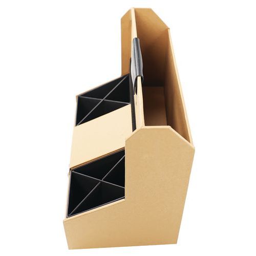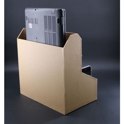 Grâce à la qualité et la robustesse de son carton (1200 g), il est capable d’emporter un poids allant jusqu’à 4 kg ( ordinateur portable, cahier 34x32, clavier compact, petits matériels de bureau,…).