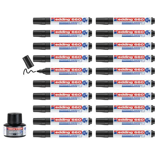 | Intitulé du produit | Pack 20 marqueurs e660 noirs + 1 recharge offerte, Encre coloris: Noir, Corps matériaux: Plastique |
