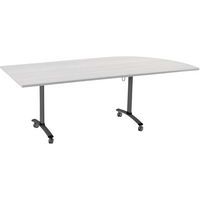 Pack de réunion Axe composé de 4 tables avec angle intégré dont 2 à gaucheet 2 à droite formant une table ovale une fois assemblées. Plateau stratifié permettant des repas et le nettoyage à l’eau savonneuse Plateau pivotant permettant un gain de place pour le rangement. Verrouillage automatique du plateau en position travail (horizontal) et position verticale (stockage) Système de liaison rapide entre les plateaux par vis molette. Equipé de 4 roulettes Ø 75 mm avec frein. Plateau stratifié épaisseur 19,6 mm, chants ABS épaisseur 2 mm, hauteur 72 cm. Piètement métal laqué époxy. Fabriqué en France Livré pieds démontés.