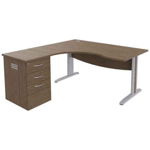 Pack bureau asymétrique Quatuor pied L métal retour à droite avec caisson hauteur bureau offrant un grand espace de travail Plateau panneau de particules épaisseur 25 mm, chants plaqués. Caisson 3 tiroirs dont 1 pour dossiers suspendus, avec serrure centralisée. Pieds métal forme L avec passage de câbles sous baguettes bois amovibles. Bureau avec voile de fond et obturateur passe câbles sur plateau. Bureau retour à gauche profondeur 120 cm équipé de vérins de réglage d'aplomb. Bureau asymétrique livré prêt à monter avec notice. Caisson hauteur bureau livré monté. Caisson avec serrure centralisée avec clé pliante. Plumier amovible dans tiroir haut. L/H/P caisson : 43 x 72 x 60 cm.