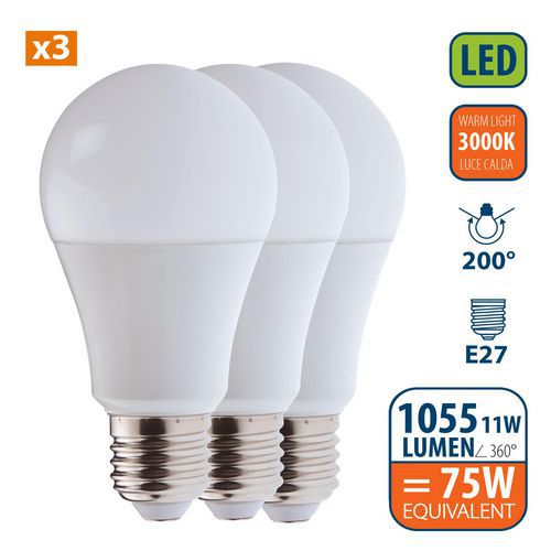 | Intitulé du produit | Pack de 3 ampoules LED standard E27 11W, Flux lumineux: 1055 lm, Type de culot: E27 |