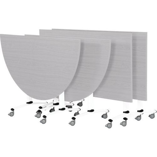 Pack de réunion Axe composé de 2 tables rectangulaires 160x68 cm + 2 tables 1/2 rondes 136x68 cm avec plateau pivotant permettant un gain de place pour le rangement. Verrouillage automatique du plateau en position travail (horizontal) et position verticale (stockage) Système de liaison rapide entre les plateaux par vis molette. Equipé de 4 roulettes Ø 75 mm avec frein. Plateau stratifié épaisseur 19,6 mm, chants ABS épaisseur 2 mm, hauteur 72 cm. Piètement métal laqué époxy. Fabriqué en France Livré pieds démontés.