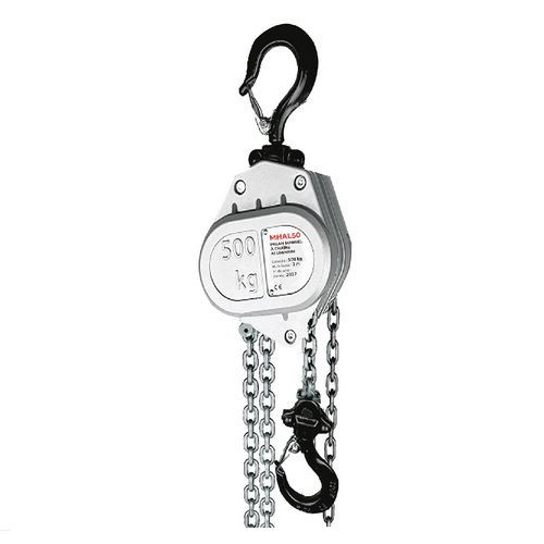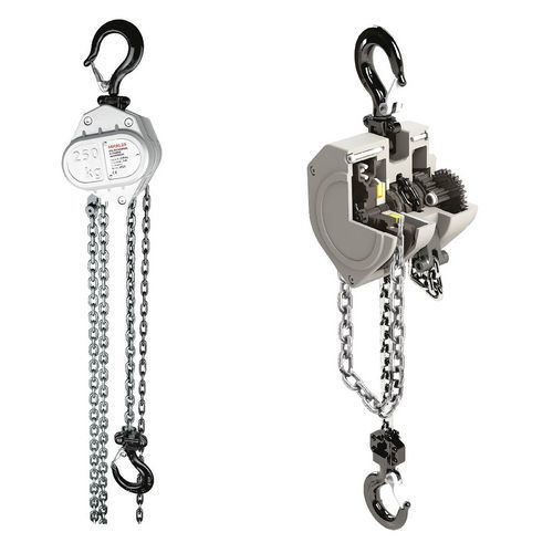 - Palan manuel aluminium à chaîne acier pour le déplacement de charges de 250 et 500 kg selon le modèle.