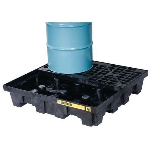 Palette de rétention de contrôle des déversements. Fonction de prévention de pollution des sols. Résiste à de nombreux produits chimiques, acides et solvants. Facile de nettoyage grâce à son caillebotis amovible de la palette de rétention. Avec couche protectrice contre les rayons UV. Design robuste. Résistante et collectant efficacement les liquides. Manutention possible à vide.