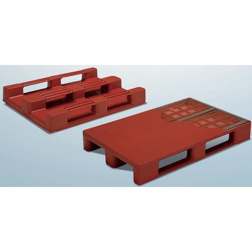 Palettes hygiéniques 1200x800 mm, 1200x1000 mm de coloris brique, noir, blanc ou gris foncé avec ou sans renforts selon les références. Elles disposent de 3 patins ou 9 pieds