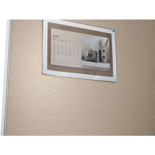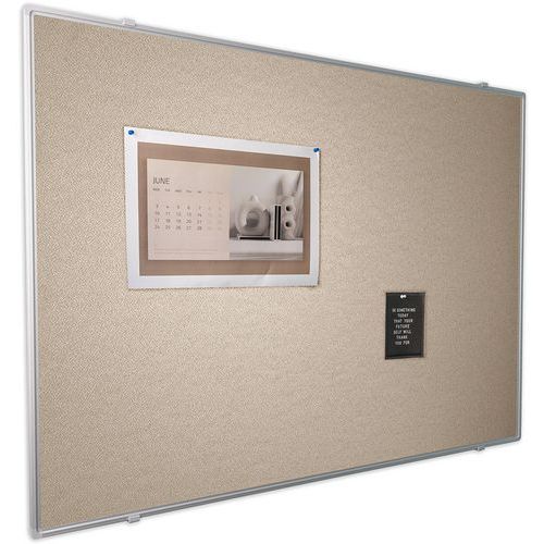 Tableau d'affichage textile punaisable. Surface haute qualité 100 % recyclée. Large éventail de coloris pour le fond. Matériau aluminium anodisé de qualité. Pourtour avec profils et coins plastique. Entretien aisé. Résiste au feu.