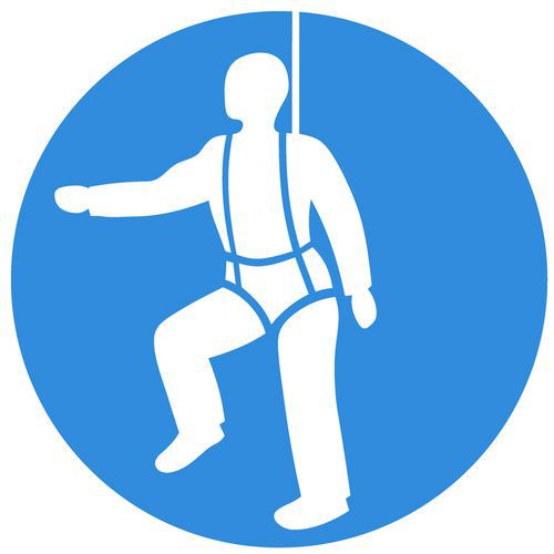 - Cercle bleu avec symbole blanc représentant un harnais de sécurité, sur fond blanc pour une visibilité claire.