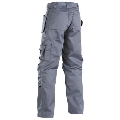 Détails: Boucle porte-marteau latérale. Boutons métalliques. Braguette métal. Passants une avec anneau en D. Triple couture à l'entrejambe. Poches: Poche arrière à soufflet. Poche couteau au niveau de la cuisse. Poche jambe avec soufflet, rabat et poche stylos, poche supplémentaire, poche téléphone et poche pour badge identifiant. Poche mètre avec porte couteau et poche stylo. Poches avant à soufflet. Poches flottantes renforcées comprenant poches ciseaux et passants porte-outils escamotables dans les poches avant à soufflet. Poches genouillères avec deux niveaux de placement possibles. Renforcement: Renforcé avec du CORDURA® aux genoux. Certification: EN 14404 avec protections genoux certifiées EN14404, art 4000, 4008, 4018.