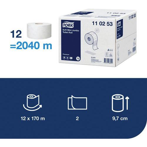 Papier toilette Mini et Maxi Jumbo Tork Premium, Nb de plis: 2, Rouleau longueur: 1700 cm, Coloris: Blanc Papier toilette Mini et Maxi Jumbo Tork Premium, Nb de plis: 2, Rouleau longueur: 1700 cm, Coloris: Blanc