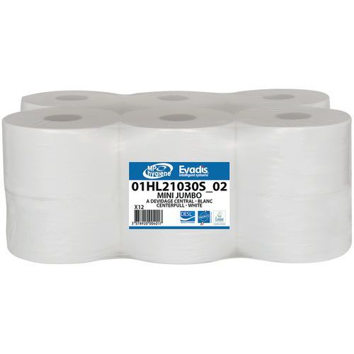 | Intitulé du produit | Papier toilette Mini Jumbo, Nb de plis: 2, Rouleau longueur: 210 m, Coloris: Blanc, Grammage: 14.5 g/m² |