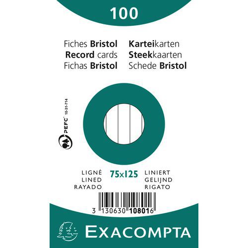 | Intitulé du produit | Paquet 100 fiches bristol ligné non perforé 75x125mm, Grammage: 205 g/m², Nb de feuilles/ramette: 100 |