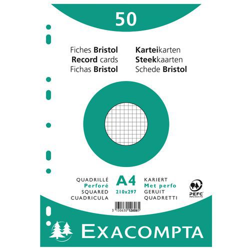 | Intitulé du produit | Paquet 50 fiches sous film quadrillé 5x5 perforé 210x297mm, Grammage: 205 g/m², Nb de feuilles/ramette: 50 |