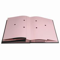 Couverture plastifiée, munie d'un porte-étiquette sur la face avant Intérieur en carte rigide 300 g/m2 Avec perforation en 3 points des compartiments Dos extensible à soufflets Encoches renforcées dans la partie intérieure des pages