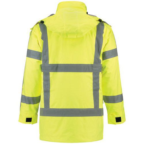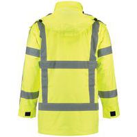 Parka haute visibilité réalisé conformément aux directives du Rijkswaterstaat (RWS) néerlandais. Étanche au vent et à l’eau, respirant et conforme à la norme EN343, classe 3:3, doté de coutures enduites, d’un enduit PU et de zips laminés déperlants. Haute visibilité conformément à la norme EN ISO 20471:2013, classe 3. Ce parka est doté d’une capuche amovible par zip qui se range également dans le col, d’une poche verticale avec zip déperlant, d’une poche intérieure et d’une poche pour téléphone portable. Il est également doté d’un dos rallongé, d’un zip séparable à double curseur et d’un double rabat-tempête anti-pluie. Ce parka possède une doublure thermique amovible, ce qui le rend utilisable à n’importe quelle saison.