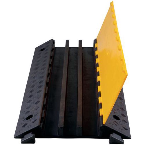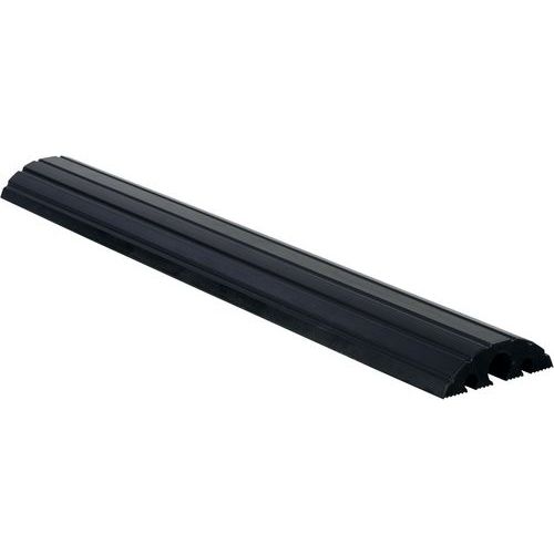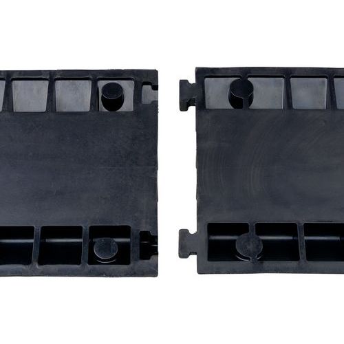 Passe-câble modulaire à canaux avec couvercle de protection. Assemblage simple et sûr des modules avec pattes à enclipser. Matériau caoutchouc plein noir avec couvercle PE robuste. Caoutchouc teinté dans la masse: résistance au froid et traffic intense. Goulotte profilée pour un glissement parfait des véhicules à leur passage.