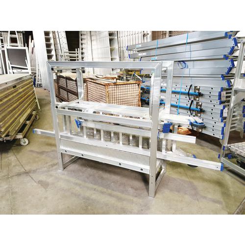 Robuste passerelle aluminium pour travail en hauteur en toute sécurité. Ultra stable grâce à deux stabilisateurs réglables munis de pieds pivotants. Encombrement réduit avec partie escabeau démontable (garde-corps fixe).