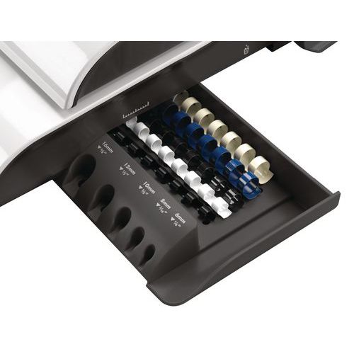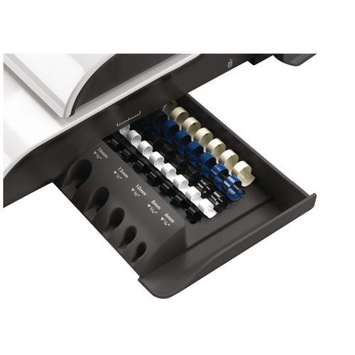 Reliure facile grâce aux dents de supports de l'anneau inclinées. Butée de taquage réglable pour aligner précisément tous vos documents. Perforelieuse dotée d'un tiroir de rangement avec chargeur de dos de reliure et documents. Ouverture automatique du tiroir à confettis pour éviter les bourrages. Capacité de reliure de 300 pages avec dos de reliure d'une dimension maximale de 38 mm. Pour perforer et relier