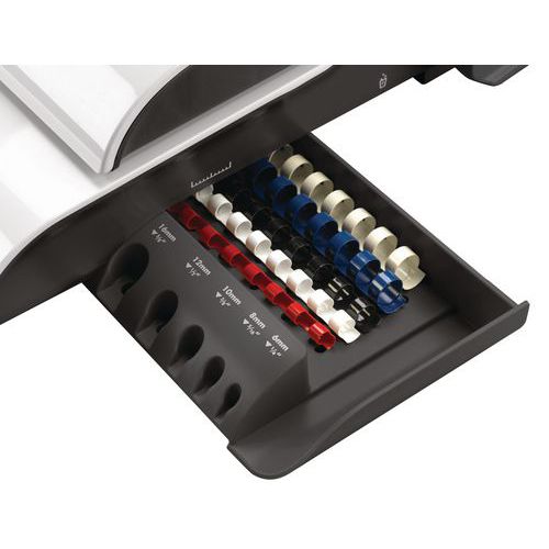 Reliure facile grâce aux dents de supports de l'anneau inclinées. Butée de taquage réglable pour aligner précisément tous vos documents. Perforelieuse dotée d'un tiroir de rangement avec chargeur de dos de reliure et documents. Ouverture automatique du tiroir à confettis pour éviter les bourrages. Capacité de reliure de 300 pages avec dos de reliure d'une dimension maximale de 38 mm. Pour perforer et relier