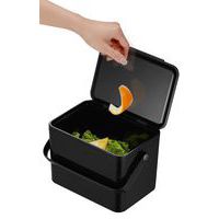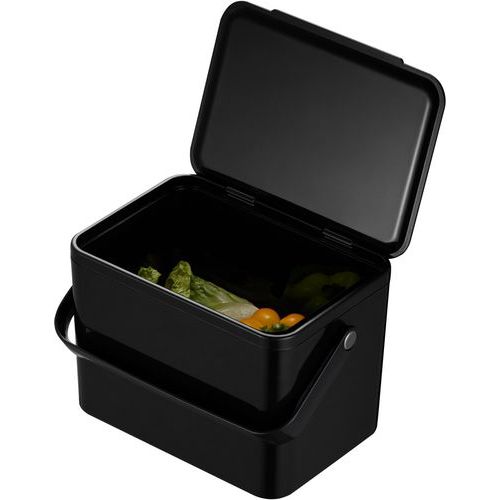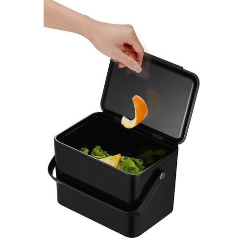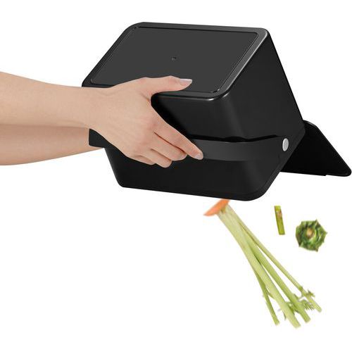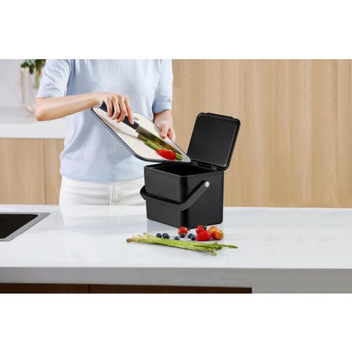 Poubelle compacte en matière synthétique pour déchets organiques avec une poignée pratique qui facilite les déplacements.