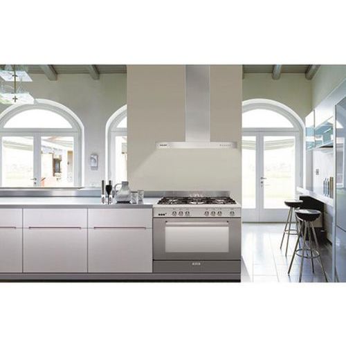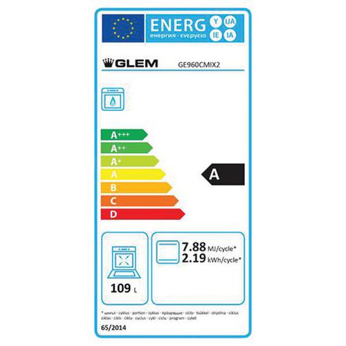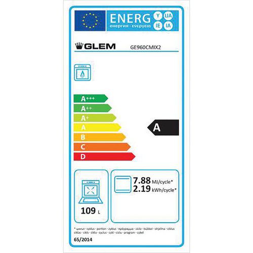 Piano de cuisson - Four gaz - 3 modes de cuisson dont Gril + tournebroche - Gril électrique 2 kW - Minuteur sonore 60 minutes - Allumage électronique ''bouton'' - Eclairage - Panneaux catalytiques autonettoyants - Gradins fils - Contre-porte plein verre avec verre démontable - Porte 2 vitres - Tournebroche - Allumage de la table électronique ''bouton''- 5 brûleurs dont 1 triple couronne 3,8 kW - Sécurité gaz par thermocouple - Grilles fonte - Départ de crédence - Coffre de rangement chauffe-plat - Plinthes cache-pieds noires de série - Ventilateur tangentiel aspiré : l'air chaud du four est rejeté sur l'arrière, pas de souffle d'air en façade - Homologué pour être encastré entre deux meubles de cuisine, selon la norme UNI EN 30-1-1 classe 2 - Finition inox.