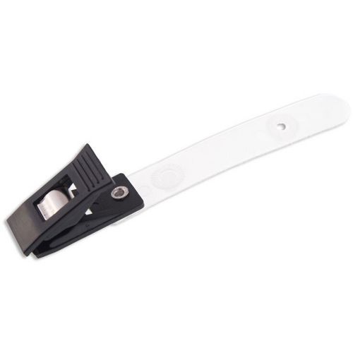 - Pince crocodile plastique avec lanière qui se clipse dans la perforation du badge.