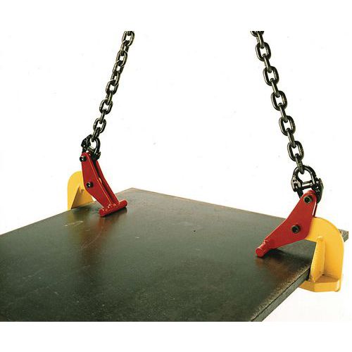 Accessoires de levage pour tôles ou plaques horizontales. Pinces équipées d’un levier basculant qui assure le serrage de la charge. Placez votre charge à l'intérieur des pinces et le serrage s'éffectue par le levage. Compacte et ultra-légère.
