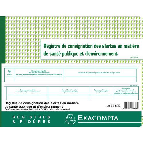 | Intitulé du produit | Piqûre registre de consignation des alertes 24x32cm, Modèle: Registre de consignation des alertes |