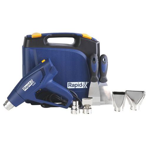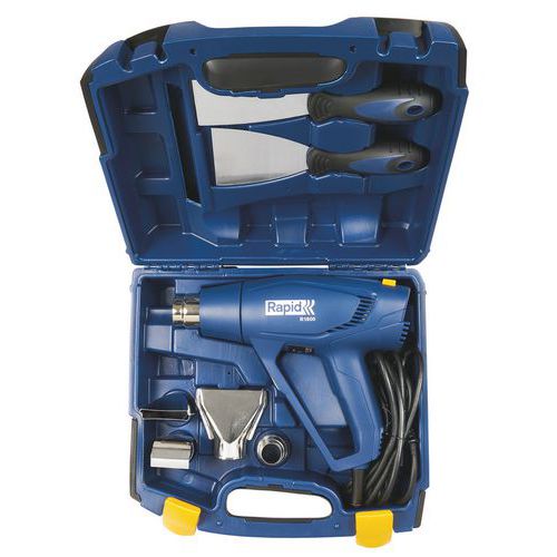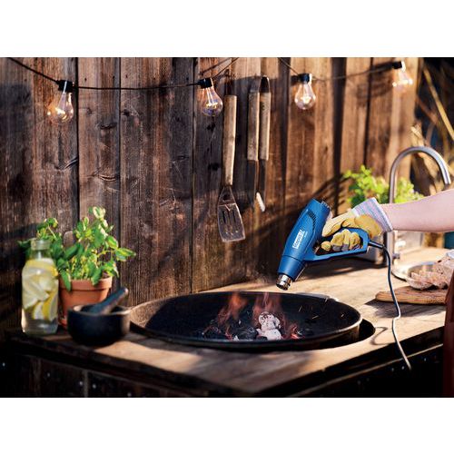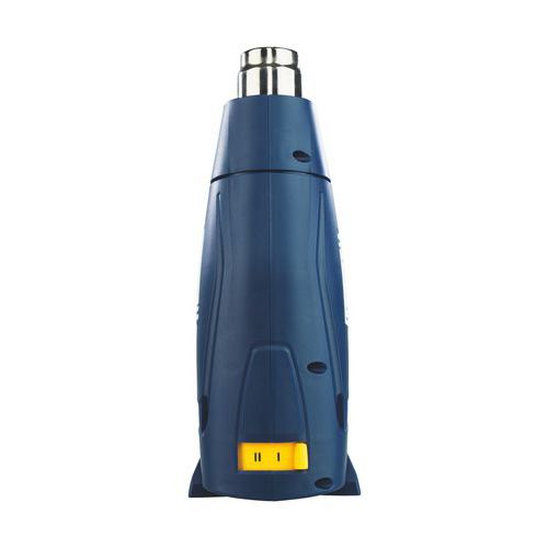 Pistolet air chaud possède 2 réglages de débit d'air, protection de poignée, base stable pour garantir un travail en position verticale avec les deux mains libres, coffret incluant 2 spatules et 4 buses.