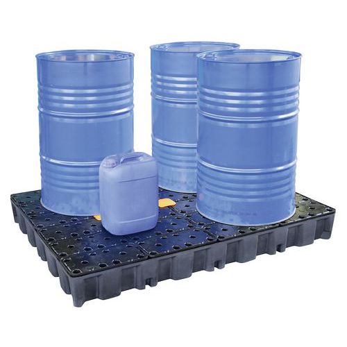 Bacs empilables en polyéthylène. Disponibles en différentes tailles, pour constituer une plate-forme de rétention. Caillebotis robustes et amovibles avec surfaces anti-dérapantes. Les éléments de liaison (accessoires) assurent la modularité de l’installation. Poste combiné de stockage et de soutirage