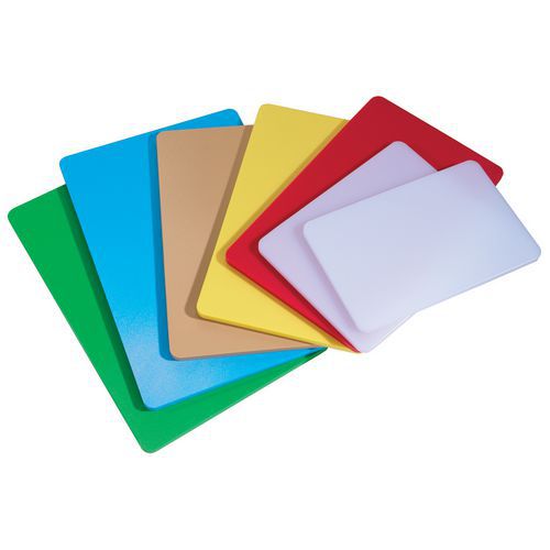Sans pieds, chanfreinée. L’utilisation de planches de couleurs différentes selon les produits à couper limite les risques de contamination croisée. (6 au choix) Matériau hydrofuge, bonne rigidité et excellente résistance aux chocs, même à basse température. PEHD : polyéthylène haute densité fabriqué par pressage de la matière. Très résistant aux coups de couteaux et très dense. Planches lisses, chanfreinées, faciles à entretenir.