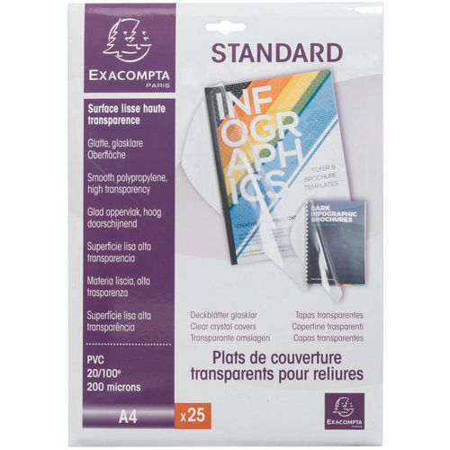 | Intitulé du produit | Plat de couverture pour reliure en PVC 200 microns, Format: 210 x 297 mm (A4), Matériau: PVC |