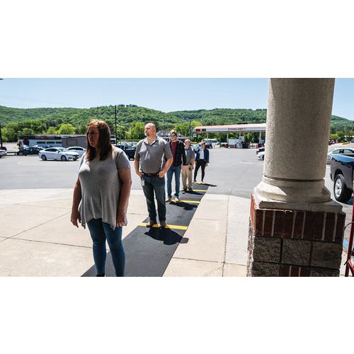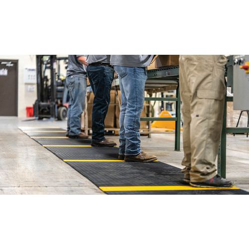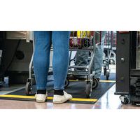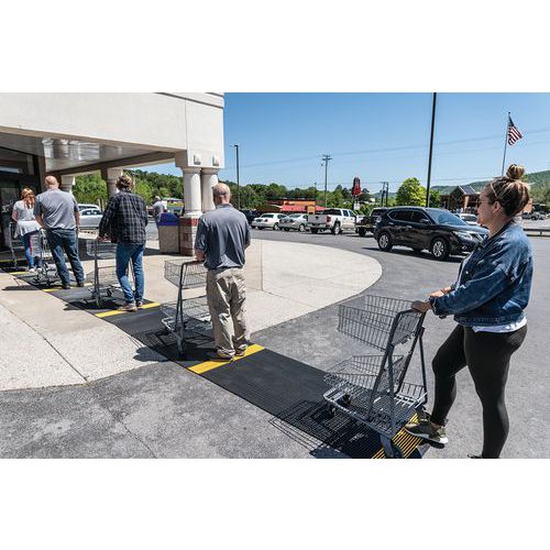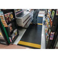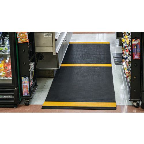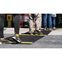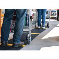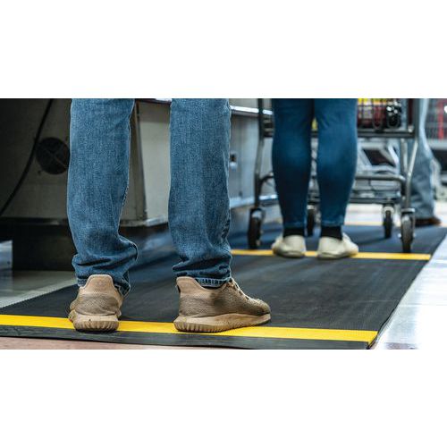 Caillebotis PVC souple noir avec bande jaune alternée de positionnement pour le respect de la distanciation sociale. Excellente absorption acoustique, très confortable en position debout avec recouvrement des aspérités au sol. Fabrication en matériau PVC non poreux offrant une résistance naturelle à la croissance des bactéries. Construction à 2 couches croisées, avec grille PVC ouverte pour un excellent drainage des liquides. Nettoyage en toute simplicité : à soulever ou rouler pour nettoyage au tuyau haute pression. Faîtes respecter confortablement les distances de sécurité à vos visiteurs, clients, employés