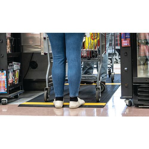 Caillebotis PVC souple noir avec bande jaune alternée de positionnement pour le respect de la distanciation sociale. Excellente absorption acoustique, très confortable en position debout avec recouvrement des aspérités au sol. Fabrication en matériau PVC non poreux offrant une résistance naturelle à la croissance des bactéries. Construction à 2 couches croisées, avec grille PVC ouverte pour un excellent drainage des liquides. Nettoyage en toute simplicité : à soulever ou rouler pour nettoyage au tuyau haute pression. Faîtes respecter confortablement les distances de sécurité à vos visiteurs, clients, employés