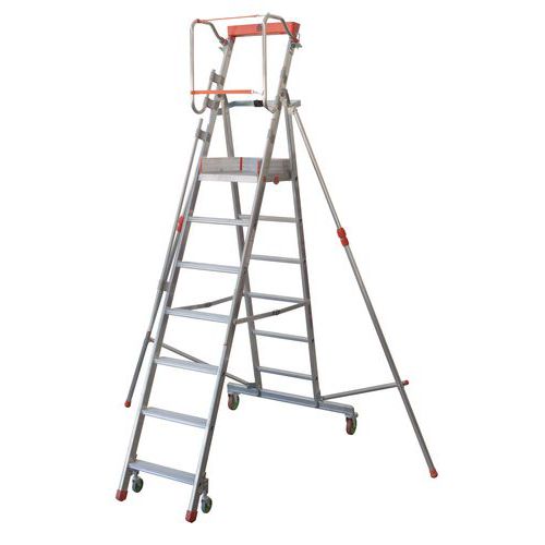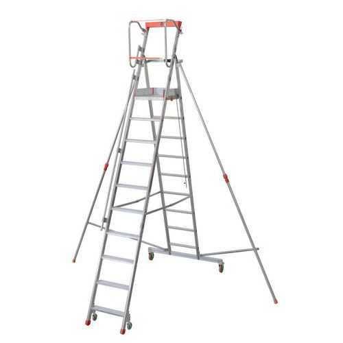 Plate-forme de rayonnage pliable avec rous et stabilisateurs télescopiques. Ouverture et fermeture très rapide grâce au RAPID SYSTEM. Barre stabilisatrice équipée de supports en fonte d’aluminium pour les roues. Marches en aluminium de 85 mm de profondeur, striées antidérapantes.