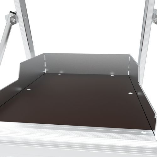Plate-forme de travail Sherpamatic. Garde-corps rigide 4 côtés avec lisses de protection antichute arrière à fermeture semi-automatique. Marches antidérapantes 80 mm. Porte-outils compartimenté amovible, résistance 25 kg, avec crochets intégrés (maxi 10kg). Tablette XL résistance 25 kg Stabilisateurs rétractables à réglage millimétrique. Plancher grand confort 590 x 400 mm antidérapante en aluminium. Espace de travail ergonomique et confortable. Roues de déplacement tout-terrain Ø175 mm.