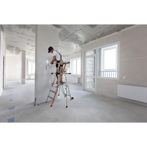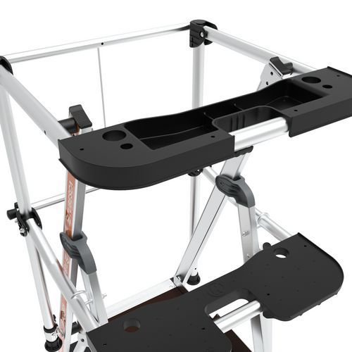 Plate-forme double tablette Raptor. Garde-corps rigide 4 côtés avec lisses de protection antichute à fermeture semi-automatique. Marches antidérapantes de 80 mm. Porte-outils compartimenté amovible, résistance 25 kg, avec crochets intégrés (maxi 10kg). Tablette XL résistance 25 kg. Plancher 500 x 400 mm antidérapant en bois éco-sourcé. Espace de travail ergonomique. Stabilisateurs rétractables à réglage millimétrique.
